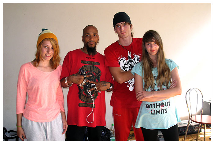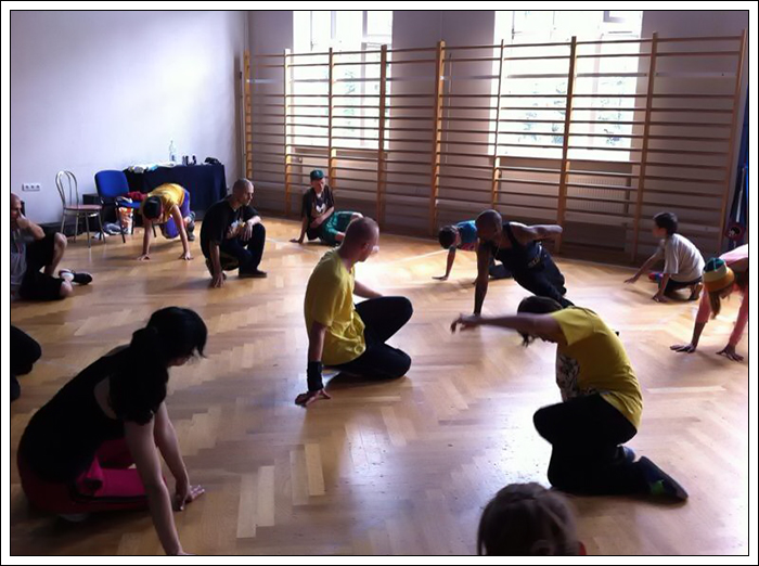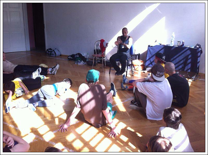 Alien powiedział, że jego warsztat będzie inny niż wszystkie, ponieważ będzie wyglądał tak jak my tego chcemy skupi się na tym, na czym my zechcemy się skupić. Na początku zajęliśmy się footworkiem. Oberwało nam się po uszach za to, że nie przykładamy wystarczająco wielkiej wagi do wykonywania wszystkich figur w dwie strony. Zapoznaliśmy się z Footworkiem Nessa a także z jego podejściem do prawidłowej postawy oraz dynamiki footworku (skracanie dystansu oraz dłonie blisko ciała). Poprawieniu tych aspektów miało służyć wykonywanie footworku ze związanymi bandanką dłońmi – swoją drogą fantastyczne rozwiązanie. Następnie poznaliśmy tak zwane „ładne ruchy” - przejścia pozwalające łączyć sixtepa w prawą stronę z tym w lewą.