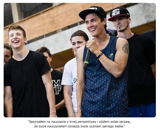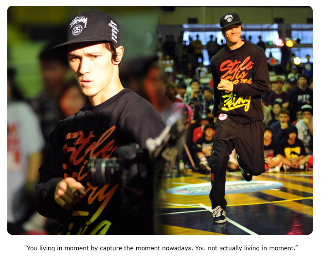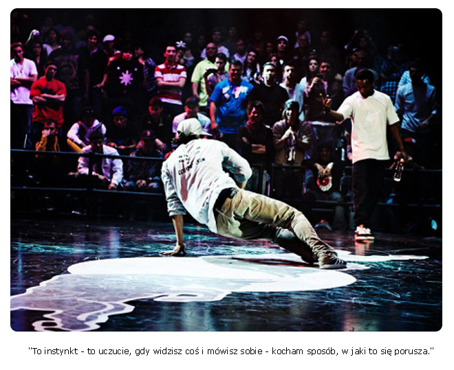 Pierwszym, co rzuca się w oczy jest jego prostota - prostota myślenia, która daje mu prawdziwość. Ten człowiek tak naprawdę nie chce wiele od tańca i nie czuje się kimś, kto jest osobą od tego, by wpływać na taniec, w szczególności breaking. Dzięki temu czujemy, jak wielkim darzy go szacunkiem.