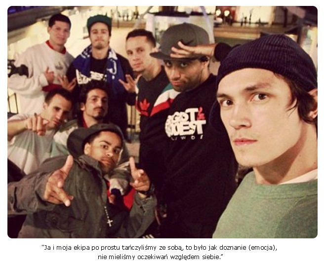 Nie masz pojęcia, jak długo zbierałem się do napisania tego artykułu. Wiedziałem, że chcę to zrobić, ale nie wiedziałem jak to ugryźć - esencja mojej osoby. Przygotowania do tego dzieła trwa kilka miesięcy, a pragnienie jego napisania męczyło mnie od połowy życia. Finalnie, po przemyśleniu upewniłem się, że piszę go przede wszystkim dla siebie. Jeśli ktoś z niego skorzysta - to fajnie. Jeśli nie - nie obchodzi mnie to. To jest właśnie piękno pisania dla siebie. Ten artykuł kończy pewien etap w moim życiu. Miłego czytania. ![]() Na wstępie słów kilka...Kiedyś sporo pisałem o inspiracji. Chciałem ją zgłębić najbardziej jak to możliwe, ponieważ zawsze cechowało mnie to, że inspirowały mnie duperele. Kiedyś uważałem to za problem, a obecnie za największa zaletę. Nigdy nie inspirowali mnie inni ludzie, inni tancerze. I mam tu na myśli taką inspirację w czystej postaci. Inspirację, której siła pcha do działania i nie pozwala spać, każe działać tu i teraz. Każdy artysta zna to uczucie i jest ono jednym z najpiękniejszych, z jakim może się spotkać ludzkie jestestwo. Jedynym wyjątkiem wśród tej całej ludzkiej masy był pewien artysta. Człowiek, który ilekroć wypuścił jakieś swoje dzieło w świat, tylekroć wzbudzał we mnie podziw. Każdy aspekt jego twórczości cechował się niebywałym artyzmem. To on nauczył mnie, jak to jest inspirować się kimś, a może nawet nie tyle kimś, co sposobem, w jaki ktoś zupełnie obcy podchodzi do rzeczy, które tworzy. To była jedyna osoba na świecie, z którą pomimo kompletnego braku kontaktu czułem jakąś dziwną poglądowo - artystyczną więź. Chciałem ją poznać, zadać kilka pytań. Po dziś dzień nie wiem czy wybrałem sobie za inspirację właśnie tego człowieka, ponieważ skrycie liczyłem, że nigdy nie będzie mi dane go poznać, (przez co pozostanie w mojej głowie pewnego rodzaju utopijną wizją doskonałości), czy może raczej dlatego, że coś w nim jest. Dzisiaj to już nie ważne. Spotkanie tego człowieka naprawdę graniczyło z cudem. Od kilku lat nie jest już aktywnym b-boyem, przez co szanse na spotkanie go na imprezach breakingowych są znikome. Nie daje warsztatów i nigdy ich nie dawał. W dodatku nie przepada za wywiadami, przez co nie dość, że ciężko jest go spotkać, to jeszcze ciężej znaleźć jakiekolwiek informacje na temat jego sposobu myślenia. A właśnie to (prawdę mówiąc) interesowało mnie najbardziej. Gdyby ktoś powiedział mi kilka miesięcy temu, że niedługo będę z nim siedział w jednym pokoju, bez wątpienia powiedziałbym, że gość postradał rozum. A tymczasem - tak właśnie było.