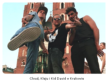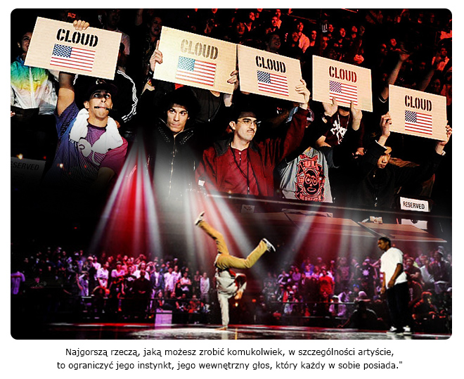 To wszystko brzmi fantastycznie, ale każdy kto wewnątrz czuje się artystą doskonale wie jak ciężko jest być wszechstronnym i pracować nad utrzymaniem poziomu na każdej płaszczyźnie rozwoju. Podczas takiego życia człowiek potrafi zwariować. Co swoją drogą często spotyka artystów. W takim razie, jak kierować energię? Jak ustalać priorytety? "Gdy budzisz się rano, cokolwiek co poczujesz po przebudzeniu powinno być twoim priorytetem. Musisz tak robić, ponieważ każdy dzień jest inny. To sposób, w jaki ja się nauczyłem to robić. To bywają trudne chwile, gdy pytasz siebie: Co robić? Jak mam postąpić? Ja podchodzę do tego tak: nie czuje dzisiaj robienia muzyki? Czuje taniec? To idę i tańczę!" ![]() Profesjonalny ruchowiecGdy już odrobinę poznaliśmy historię Daniela, a także jego umysł można spróbować zanurzyć się w jego jakość ruchu i spróbować w jednym miejscu skumulować informacje na temat ewolucji jego jakości ruchu, która obecnie jest jedną z najbardziej charakterystycznych w tanecznym świecie. Od najmłodszych lat ciągnęło go do ruchu. Jego ciało pragnęło wyrażać siebie poprzez sztukę. Gdy był mały jego głównymi inspiracjami byli wojownicy. Zamieniał się w wojownika ninja i fruwał po drzewach. Udawał, że jest jak Jackie Chan albo Bruce Lee. Później odnalazł taniec, więc jego inspiracje ruchowe zaczęły bardziej lub mnie krążyć wokół dziedziny tańca. Gdy zaczynał, jego głównym "sposobem" na taniec były power moves i akrobacje. Jednak, gdy trochę urósł, a jego ciało się wydłużyło - ewolucje, które wykonywał zaczęły najnormalniej w świecie sprawiać mu ból. Nie były dla niego już tak proste. To był pierwszy impuls, by w breakingu szukać czegoś więcej. Właśnie wtedy natrafił na ekipę Style Elements i takie postaci jak Remind czy Crumbs. To był również czas, gdy poznał Ken Swifta i Easy Rocka. To dzięki nim docenił "stylowe" tańczenie breakingu. To jednak nadal było zbyt mało. Jego ruch uległ kolejnej zmianie, gdy trafił na nagrania tancerzy z Europy. Inspirowali go tacy tancerze jak Storm (Niemcy) czy Mauritzio (Włochy). Pokazywali swoim tańcem jak można opanować świetny "styl" i połączyć go z niesamowitymi power movesami. Byli kompletnymi B-Boyami władającymi wszystkimi elementami breakingu. To ponownie zmusiło Clouda do refleksji nad swoim ruchem i szukania równowagi między jego powerową naturą, a stylowym i pełnym kreatywności umysłem. "To instynkt - to uczucie, gdy widzisz coś i mówisz sobie - kocham sposób, w jaki to się porusza." Ponownie instynkty wiodą tu prym. Dodatkowo Cloud ponownie odnosi się do swoich początków, jak do okresu "najlepszego na taniec”, pomimo iż wtedy nie miał takiej jakości ruchu, tych osiągnięć i takiego statusu to bardzo tęskni za tym czasem.