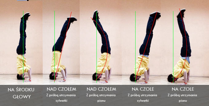 Mówiąc o podstawowym gimnastycznym staniu na głowie mówimy o staniu na głowie, gdzie nasze dłonie i głowa są ustawione w kształcie trójkąta równoramiennego. Nasze centrum jest rozciągnięte i wspierane przez dolne partie pleców oraz brzuch, pośladki napięte, nogi złączone stopy obciągnięte na point. Całe ciało powinno być skierowane prostopadle do podłoża, mówiąc krótko mamy stać w pionie. Jeśli staniemy na czole niemożliwym jest zachowanie poprawnej sylwetki i jednoczesne utrzymanie pionu. Albo utrzymamy sylwetkę i będziemy lekko pochyleni w przód albo nie będziemy trzymać sylwetki i będziemy przegięci w tył… kolejna kwestia, która wyklucza stanie na czole.