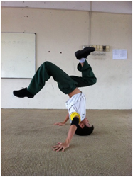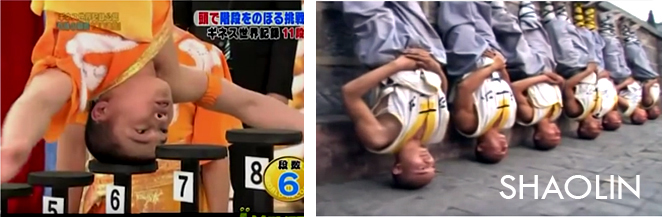 Patrzmy dalej. Już w samym Breakingu, którego jestem fanem można zauważyć, że centrum głowy jest miejscem, na którym stoją bboys. Sam od zawsze stoję na środku głowy i żyję. To jeszcze nie wszystko. Chcę byście zwrócili uwagę na ludzi, którzy są chyba mistrzami świata w staniu na głowie. Chodzi o Mnichów z klasztoru Shaolin. Jeden z nich na filmie wskakuje na samej głowie na 15 podestów! Jeszcze inni godzinami medytują stojąc na głowie.