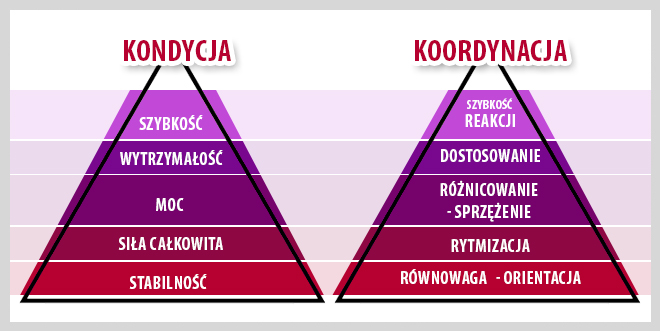 Większość trenerów korzysta głownie z jednej piramidy. Ponieważ jest ona bardziej podstawowa i rozwija większość cech potrzebnych do prawidłowego funkcjonowania nie tylko organizmu sportowca, ale po prostu organizmu zdrowego człowieka. Mowa oczywiście o piramidzie kondycyjnej, natomiast z tej drugiej - czyli koordynacyjnej biorą tylko to czego rozwój jest wymagany i przydatny w dyscyplinie, którą akurat trenują. W przypadku tańca mamy do czynienia z ruchem, który jest tak zróżnicowany, nieprzewidywalny i zależny od tak wielu czynników zewnętrznych, że jesteśmy zmuszeni korzystać z obydwu piramid prawie w takim samym stopniu, z lekkim naciskiem na kondycyjna, ponieważ to ona jest podstawą, na której budujemy resztę.