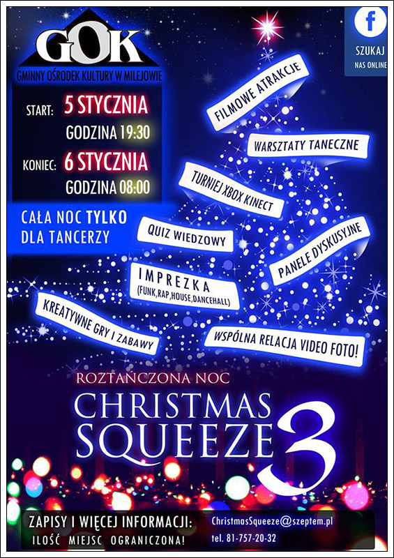 Zawsze wychodzę z założenia, że potrzeba matką wynalazków a kreatywność ojcem. Nic nie rozbudza kreatywności bardziej niż nakładanie ograniczeń. Jeśli masz wszystko, czego potrzebujesz, nie musisz się wysilać by coś zrobić, jeśli natomiast czegoś ci brakuje zaczynasz kombinować jak to zastąpić. Dlatego o tym piszę? Dlatego, że w tym roku mogło zabraknąć najbardziej kojarzonej z Milejowem tanecznej imprezy. Ale nie zabrakło. Cały tegoroczny zamęt dotyczący wyborów blokował podejmowanie jakichkolwiek przedświątecznych decyzji dotyczących trzeciej edycji Christmas Squeeze.