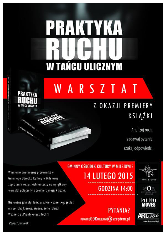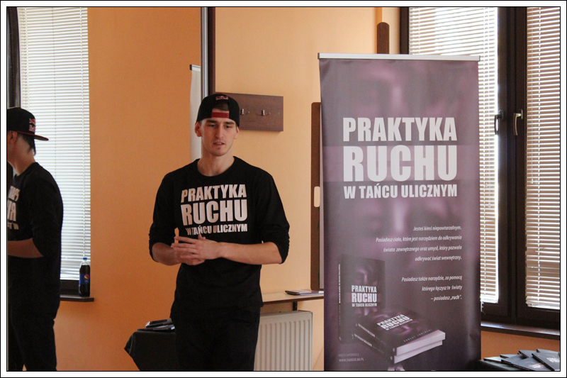 14 Lutego 2015r. był jednym z najważniejszych dni w moim życiu. Wiem, że ostatnio często mówię coś w stylu „to ważny dla mnie moment”, ale co ja poradzę, że każdego dnia robię wszystko, by iść do przodu. Ten dzień jednak w hierarchii wartości był na pierwszym miejscu, ponieważ właśnie wtedy światło dzienne ujrzał projekt, nad którym pracowałem prawie 3 lata. Tego dnia odbyła się bowiem premiera mojej książki pt. Praktyka ruchu w tańcu ulicznym”. Sama idea napisania książki była dla mnie bardzo odległym marzeniem, które wydawało mi się nieosiągalne dla chłopaka z takiej aglomeracji jak nasza. Mówiąc prościej: zawsze chciałem, ale się bałem. Z pomocą jak zawsze przyszedł mi taniec. Im dłużej człowiek tańczy, tym bardziej poznaje siebie, bada i sprawdza swoją wartość. Właśnie taniec pozwolił mi uwierzyć, że moje miejsce pochodzenia jest plusem a nie minusem a ja sam mogę zrobić, co tylko zechce. Jedynym, co mnie ogranicza – jestem ja sam. Książka jest dosyć skomplikowanym w swej prostocie wytworem. Odnosi się zarówno do tańca jak i do życia. Początkujący znajdzie w niej kompendium wiedzy a zaawansowany na pewno odszuka w niej mnóstwo inspiracji do dalszego rozwoju. Książka jest skierowana w dużej mierze do instruktorów. Prezentuję w niej mnóstwo metod treningowych z naciskiem na schematy wyciągnięte prosto z czysto sportowego podejścia. Więcej o samej książce można przeczytać tutaj: https://praktykaruchu.none.pl/