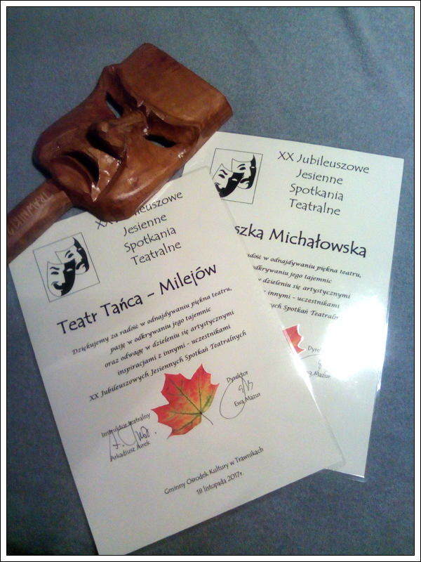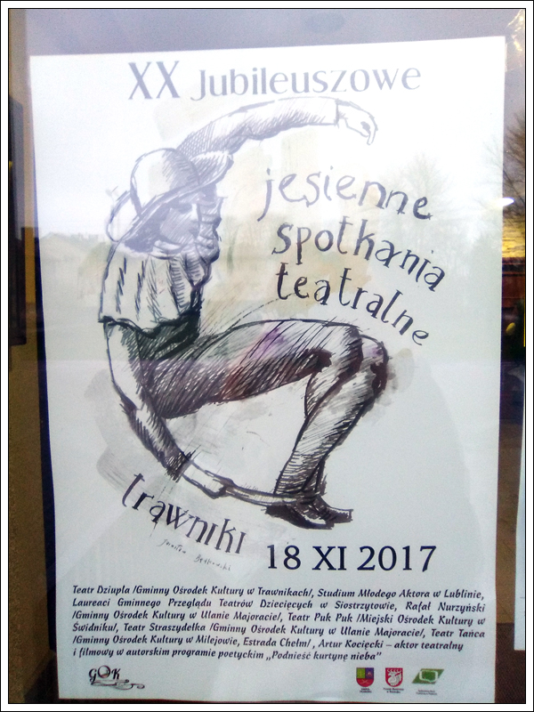 Tego dnia odbyły się XX Jubileuszowe Jesienne Spotkania Teatralne w Trawnikach. Cała ekipa "Jej drogi" spotkała się po raz kolejny by zaprezentować taneczny spektakl przed publicznością. Gdy tylko dostaliśmy zaproszenie, wszyscy tancerze bardzo chętnie je przyjęli. Nasz spektakl był przedostatni, jednak publiczność była bardzo liczna i znów spotkał nas niesamowity odbiór. Jako reżyser jestem dumna z tego jak się zaprezentowaliśmy, mimo tego że na próbie prawie nabawiłam się nerwicy. Jednak wszystko się udało, nikt nie zawiódł i wszyscy ze sceny zeszli uśmiechnięci. Miłe słowa aprobaty oraz dobre rady na przyszłośćprzyjęłam od instruktora teatralnego GOK Arkadiusza Jurka.