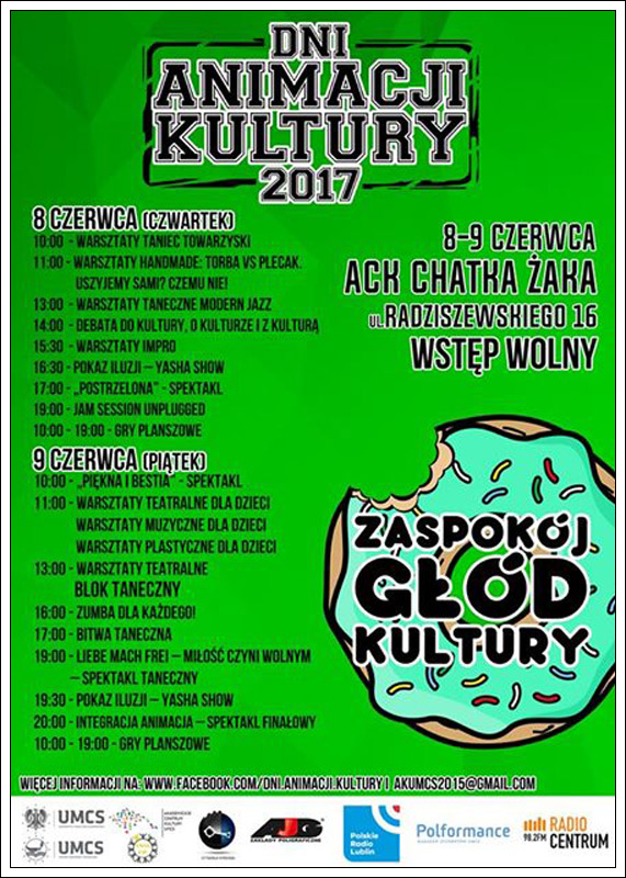Praktyka Ruchu nad Jeziorem Białym1-2 lipca 2017r.Pierwszy raz dostałem zaproszenie na ten obóz, pierwszy raz współpracowałem z tymi ludźmi i jak na pierwszy raz to muszę przyznać, że była to bardzo przyjemna przygoda i fantastycznie spędzone dwa dni. Cała firma to Lubelskie Centrum Inicjatyw Tanecznych - kiedyś tańczyliśmy dla nich pokaz ze SQUEEZE. Później długo nie było nic aż tu nagle odezwał się do mnie Grzesiek. Grzesiek obserwował moje poczynania przez kilka lat w Ulan Majoracie. W tym roku postanowił zaprosić mnie do współpracy. Zgodziłem i tak właśnie znalazłem się nad Jeziorem Białym. Poprowadziłem tam łącznie ponad 13 godzin tanecznych zajęć, z czego większość to materiał z Praktyki Ruchu. Współpracowałem z tancerkami z Chełmskiej Grupy Tańca Współczesnego "Ballo", ale także z tancerzami i tancerkami grupy tańca nowoczesnego - kocham taki Misz-masz na zajęciach. Zarówno najstarsza grupa jak i średniaki dawali sobie radę bardzo dobrze, tylko maluszki dawały oznaki zmęczenia. W każdym razie załoga bardzo przyjemna, dzieci fantastyczne. Osobiście odczułem, że moje podejście i moja praca przypadła im do gustu. Skupiłem się tam na rozwijaniu ich, chyba nawet bardziej umysłowo niż tanecznie. Ile z tego zapadło w pamięci? Ciężko powiedzieć. Wiem natomiast, że Jezioro Białe wytwarza tak fantastyczną aurę, która pozwala zapamiętać pewne chwile do końca życia. Maksymalnie niewyspany wróciłem na swoje stare śmieci. Najbardziej się cieszę, że Praktyka Ruchu sprawdziła się doskonale w kolejnym miejscu.