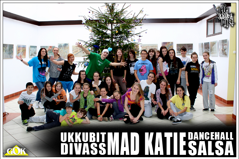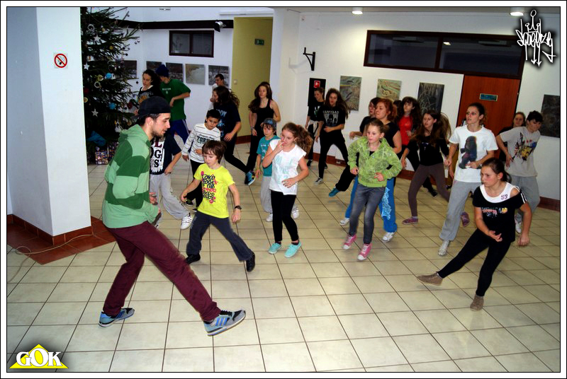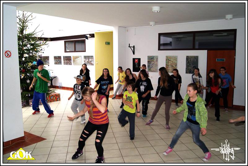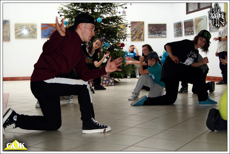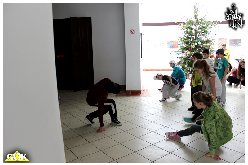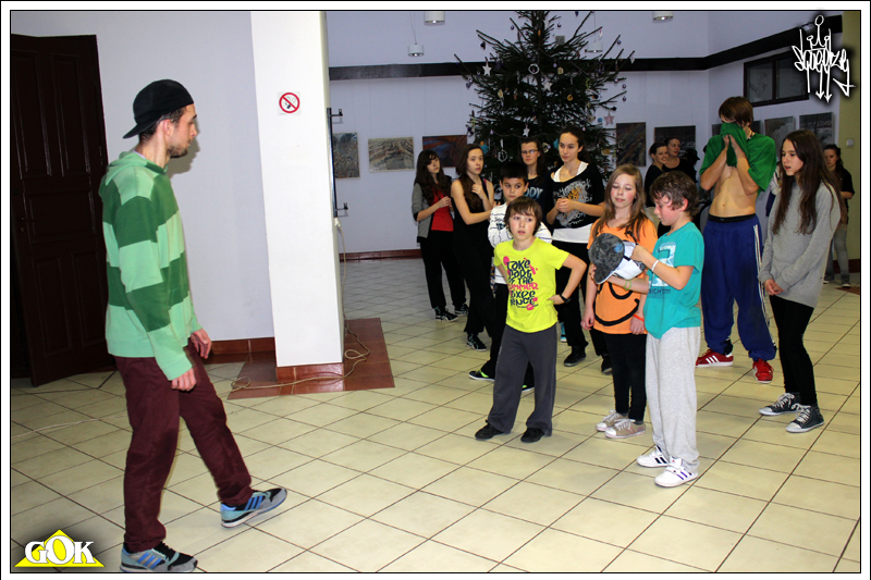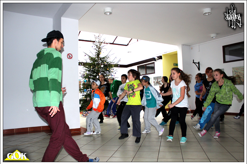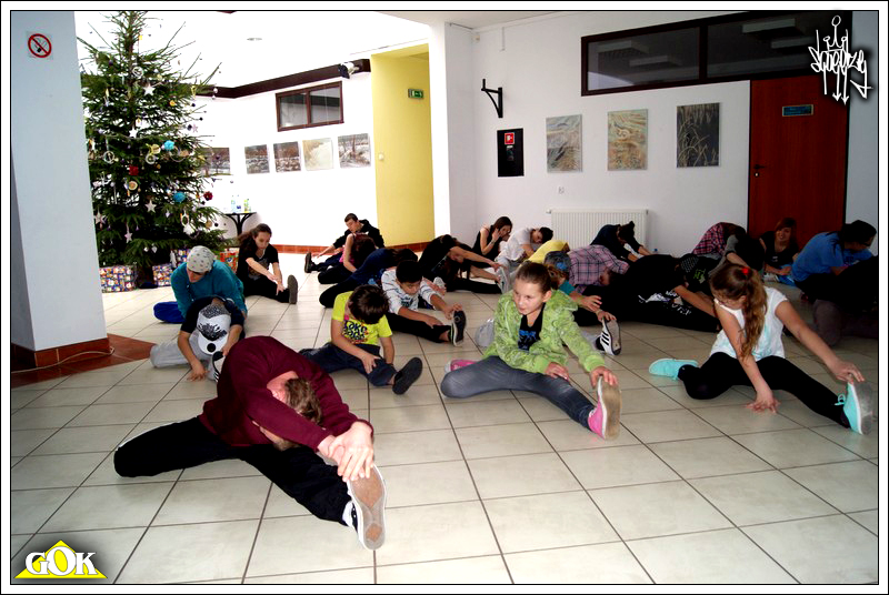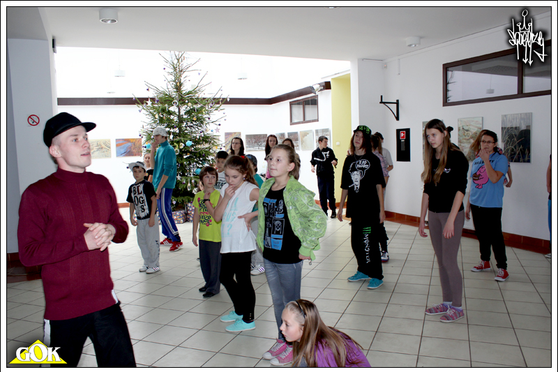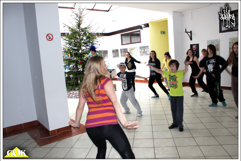 W Milejowskim Domu Kultury zostały zorganizowane otwarte warsztaty taneczne! Pomysł był na tyle spontaniczny, iż od momentu pojawienia się zamysłu w mojej głowie, do dopięcia ostatniego guzika, minął niecały tydzień! GOK Milejów postanowił zaprosić trzech instruktorów, którzy poprowadzili zajęcia z czterech różnych styli tanecznych. Były to: Kobiecy Dancehall oraz zmysłowa Salsa, które poprowadziła Mad Katie z Lublina, szalony Bboying (BreakDance) w wykonaniu Bboya Żurka ze Stalowej Woli oraz skoczny House, którym zamęczył nas Zbynio z Lubelskiej Akademii Tańca. Nasi dzielni tancerze nie schodzili z parkietu przez całe 5 godzin! Dopisała również frekwencja. Gościliśmy ludzi z Łęcznej, Trawnik a nawet Lublina. Łącznie na naszym parkiecie dzielnie walczyło prawie 40 osób! Klimat był ogromnie przyjazny a w powietrzu było czuć świąteczną radość. Cieszę się, że tak spontanicznie zorganizowana impreza jak tegoroczny „Świąteczny Uścisk” okazała się tak udanym przedsięwzięciem, z którego naprawdę wiele osób wyciągnęło całą masę tanecznie świątecznych inspiracji!