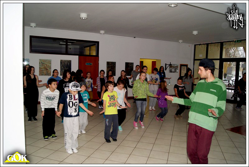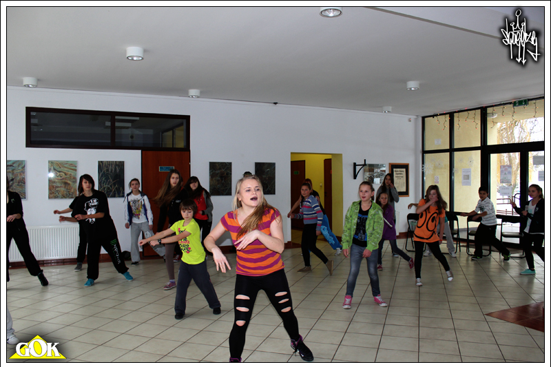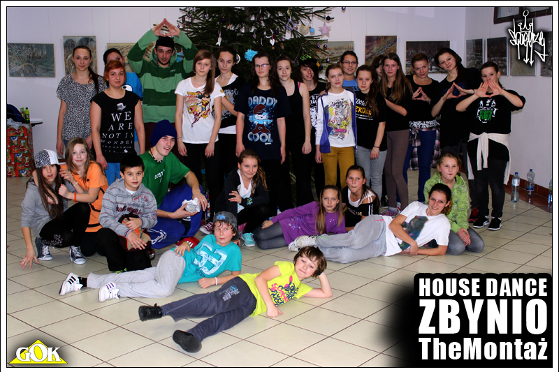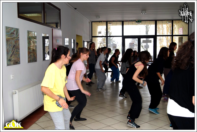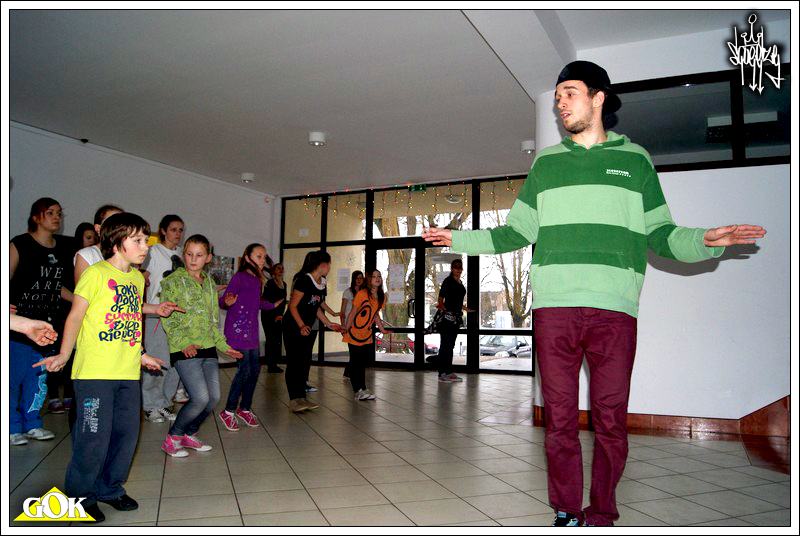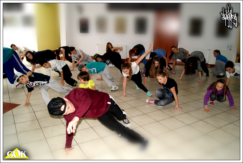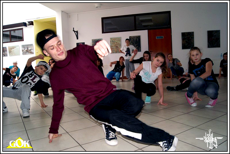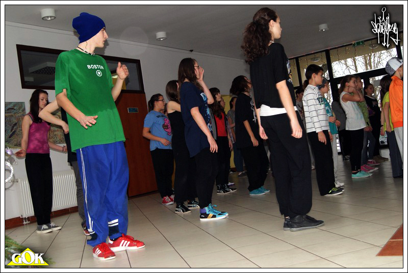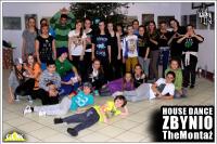 House Dance to taniec, który wymaga tyle samo poczucia rytmu co dobrego humoru i nastawiania na dobrą zabawę. Nazwa tego tańca bowiem pochodzi od klimatu domówek na których był tańczony. To i wiele więcej dowiedzieliśmy się właśnie od Zbynia, który zapoznawał nas z tym fantastycznym stylem tańca. Całe zajęcia rozpoczęły się od nauki Jackingu, czyli charakterystycznego dla House’u sposobu, w jaki tancerz powinien odczuwać rytm. To nic innego, jak House’owy Groove. Poznaliśmy sporo sposobów na trenowanie Jackingu jak i jego różnorodność i plastyczność. Następnie nadszedł czas na kroki, poznaliśmy kolejno: Heel Toe, Shuffle, Side Walk, Cross Walk, Pas de Bourree oraz Skate. Podczas nauki kroków Zbynio pokazywał jak samemu kombinować z tymi ruchami, co daje nam nieograniczone możliwości i odnajdywanie własnego stylu. Kolejnym elementem, który Zbynio wziął na warsztaty był House’owy Lofting, czyli coś na wzór parterowego Footworku z Bboyingu. Wytłumaczył, iż lofting służy do akcentowania wolniejszych momentów w muzyce oraz jest momentem odpoczynku dla tancerzy. Opisał, na czym polega tańczenie House’u w parach. Cały warsztat zakończyło okropnie męczące powtórzenie wszystkich kroków. Mimo, iż Zbynio nie zwalniał tempa, większość Milejowskich tancerzy (nawet tych najmniejszych) wytrwała do końca.