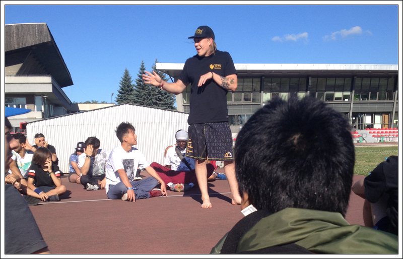 Ayumi Fukushima z ekipy BodyCarnival to japonka uznawana obecnie za najlepszą b-girl na świecie. Tak wiem, że mówić coś takiego to nadużycie, ale w tym roku została pierwszą kobietą, która dostała się do finałów Red Bull BC One, przez co w wielu miejscach uchodzi obecnie za kobiecy symbol breakingu. Na obozie nie zabrakło również jej siostry Narumi, dlatego też warsztaty były prowadzone z podwójna siłą.
